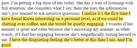 Which I just found amazing. There's the one-two punch of "it's the first time I have found Karen personally interesting," followed by him casually bragging about his own social skills. Like, I get it, he's a therapist, that's part of his job, but what? What? Had this been the only comment, I would have skipped right by this. Yes, it makes sense. Psychiatrists are not choosing patients based on who they would like to go out drinking with. It only becomes noticeable as a repeated phenomenon. There is a subtle tone here that is not normal compared to most of the other books I've read by clinicians. I'm also picking up on the fact that Baer only finds her interesting on a personal level after she begins reflecting his own mannerisms. Hmmmm.
