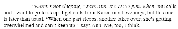 Ultimately, a decision is made: Karen's system needs to integrate now because none of the alters are getting along and it's leading to nonstop crises.