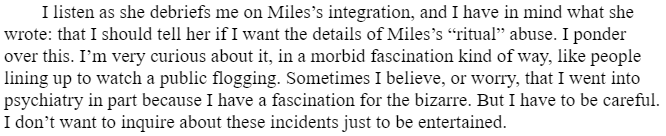 (The part I'm leaving out after this is a descriptor of the abuse suffered by this alter. I'm not including it in part because it feels personally wrong for me to post the details of other peoples' trauma, and in part because I don't want this review to consist of nothing but passages from the book. I want to write my own thoughts, too!)