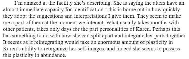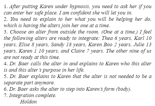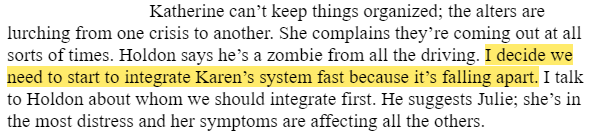 Another part of the book that catches my attention is that, eventually, much of the therapeutic process seems to be lead by Karen's own system after Baer begins admitting in sessions that he doesn't know what to do. One of Karen's alters, named Holdon, ends up writing a letter to Baer including a step-by-step guide on how to lead the next therapy sessions: